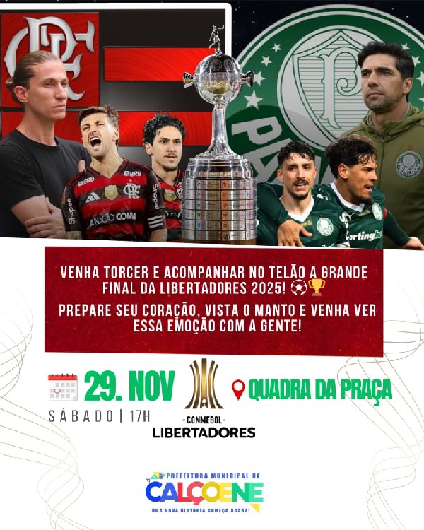 A Prefeitura de Calçoene anunciou que o telão para a transmissão da grande final da Libertadores 2025 já está garantido! No dia 29 de novembro, a Quadra da Praça será o ponto de encontro dos torcedores apaixonados por futebol, que poderão acompanhar o duelo entre Flamengo e Palmeiras em um ambiente de confraternização e muita animação.