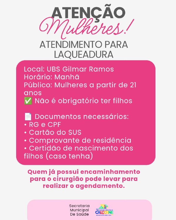 A Prefeitura de Calçoene, por meio da área de saúde, informa que o assistente social do Estado, Brendo, estará no município para realizar atendimentos voltados à abertura de processo de laqueadura.