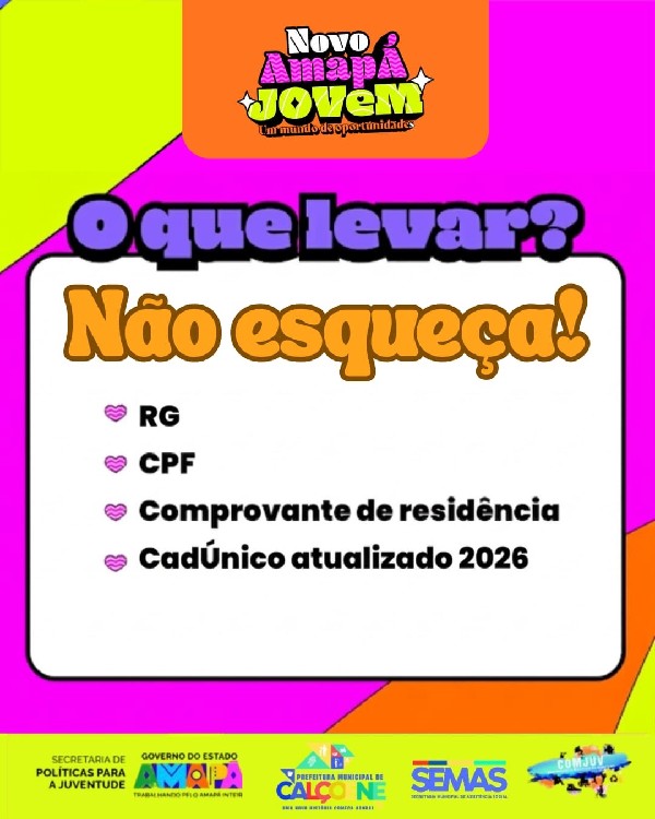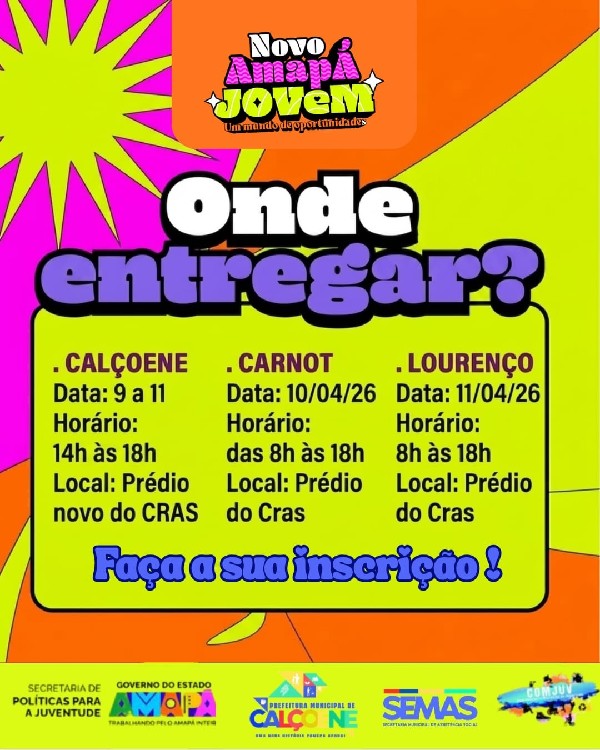 Atenção, juventude de Calçoene! Estão abertas as inscrições para o Novo Programa Amapá Jovem, uma iniciativa do Governo do Estado em parceria com a Prefeitura de Calçoene, a Secretaria Municipal de Assistência Social (SEMAS) e o Conselho Municipal da Juventude (COMJUV).